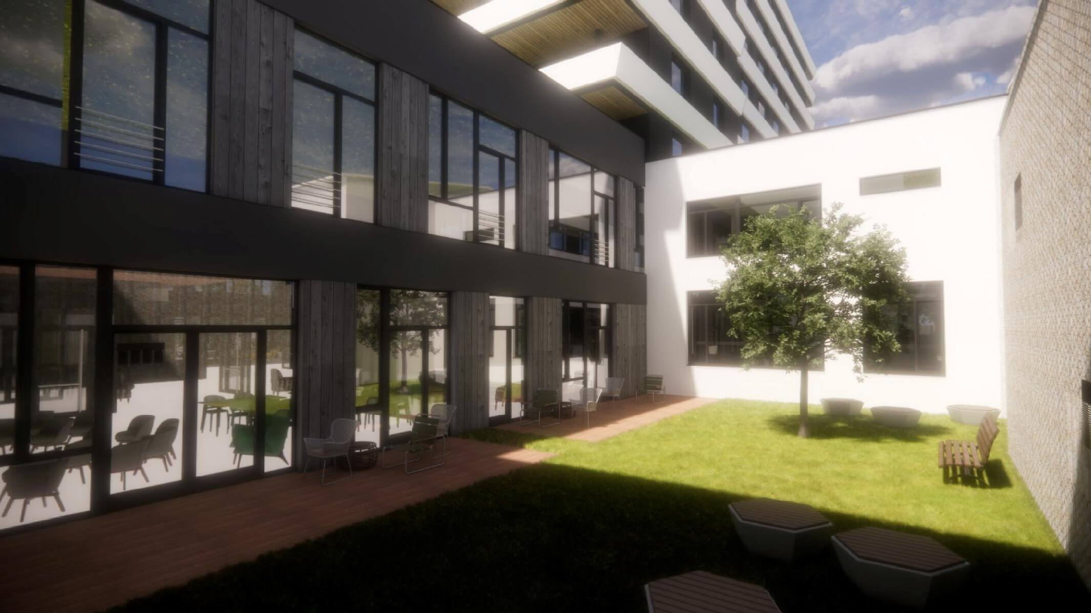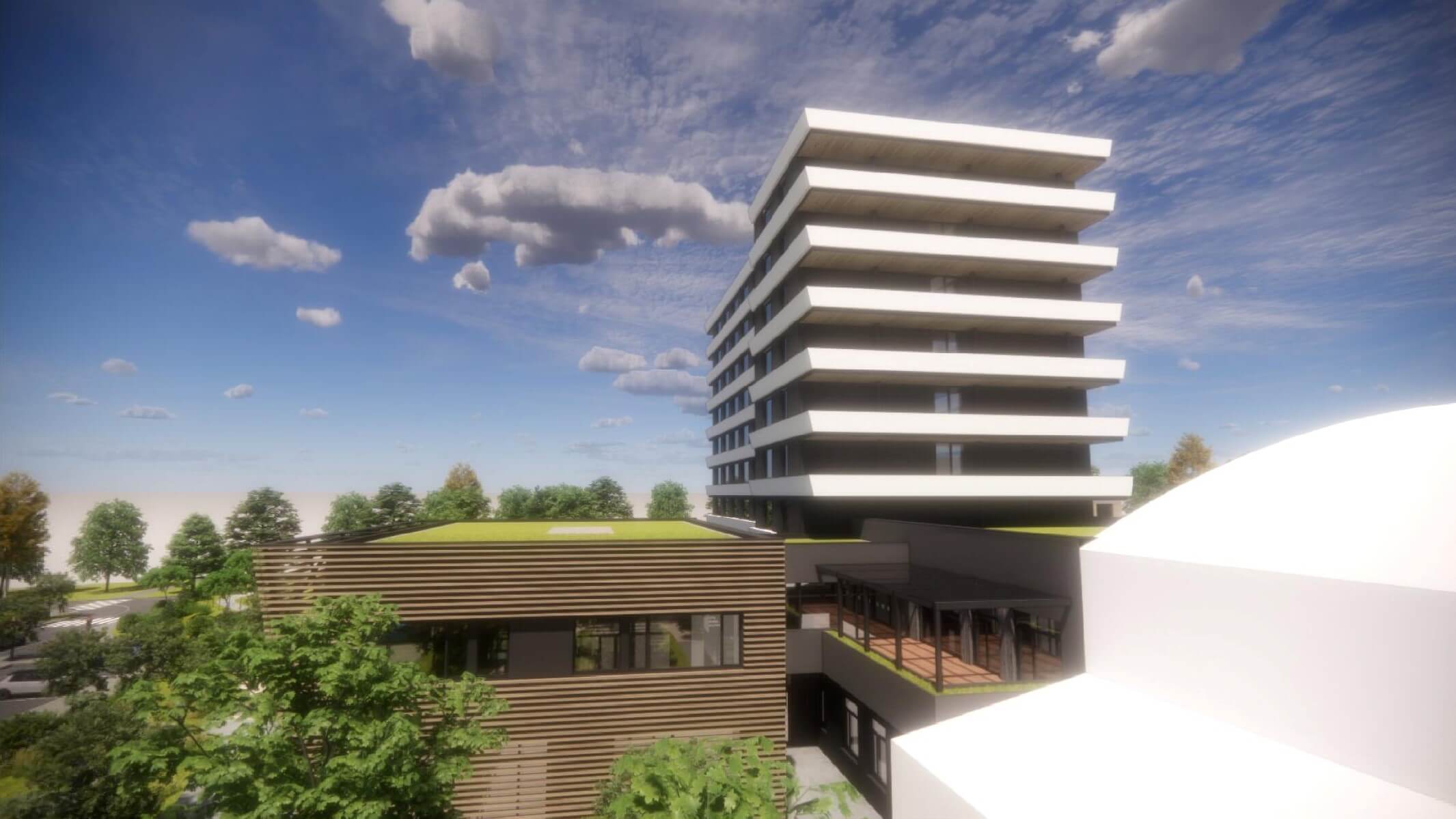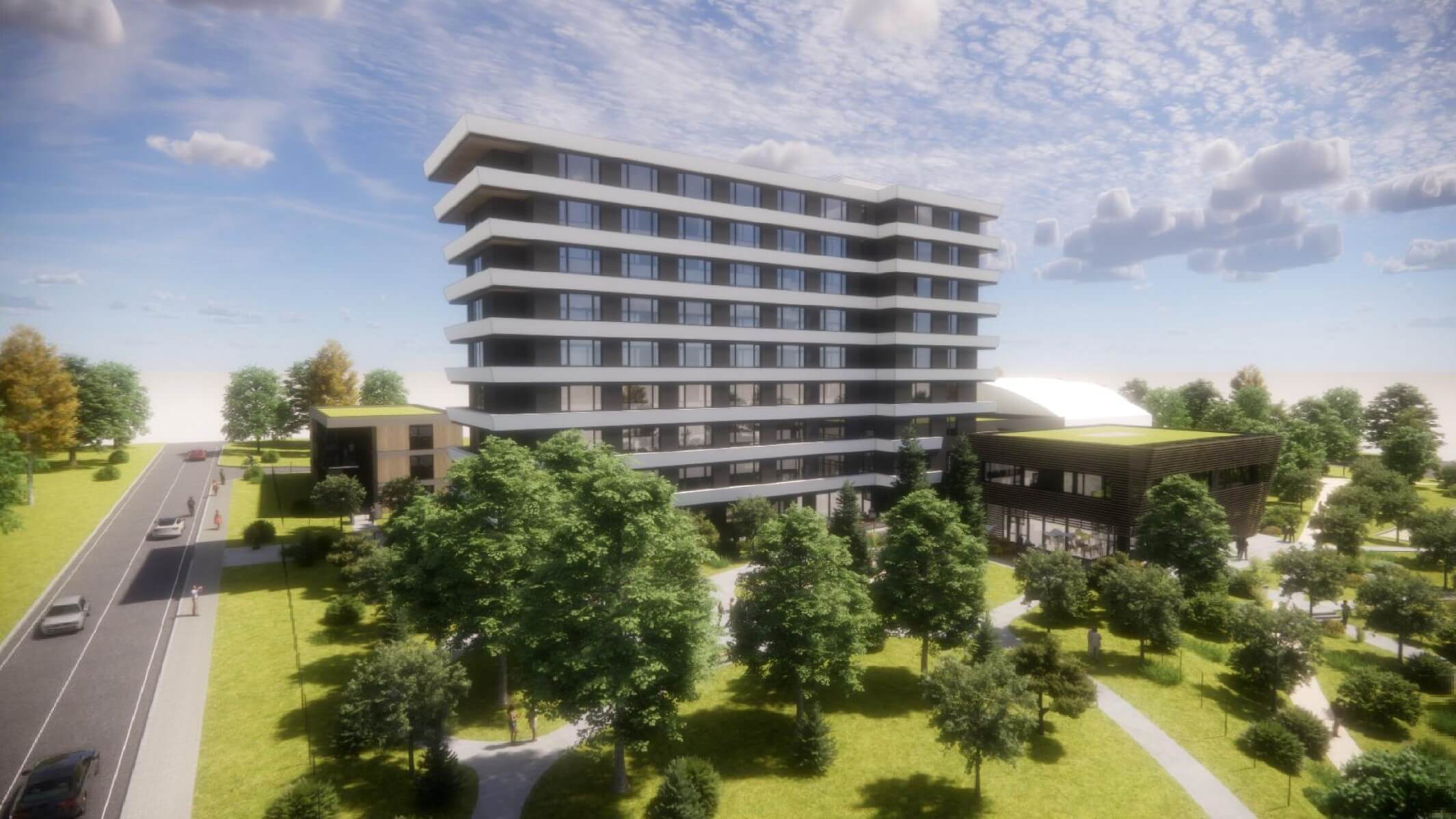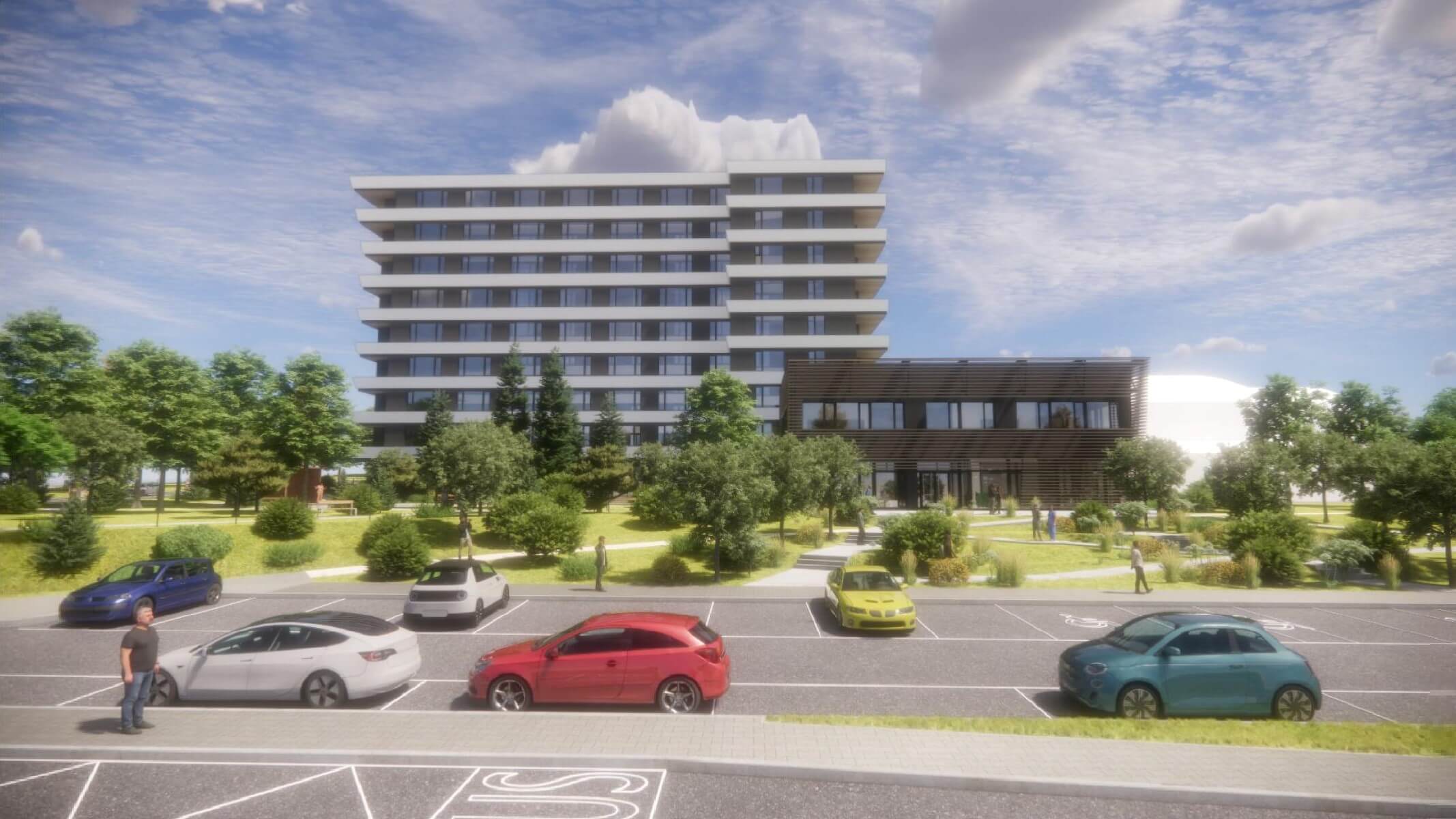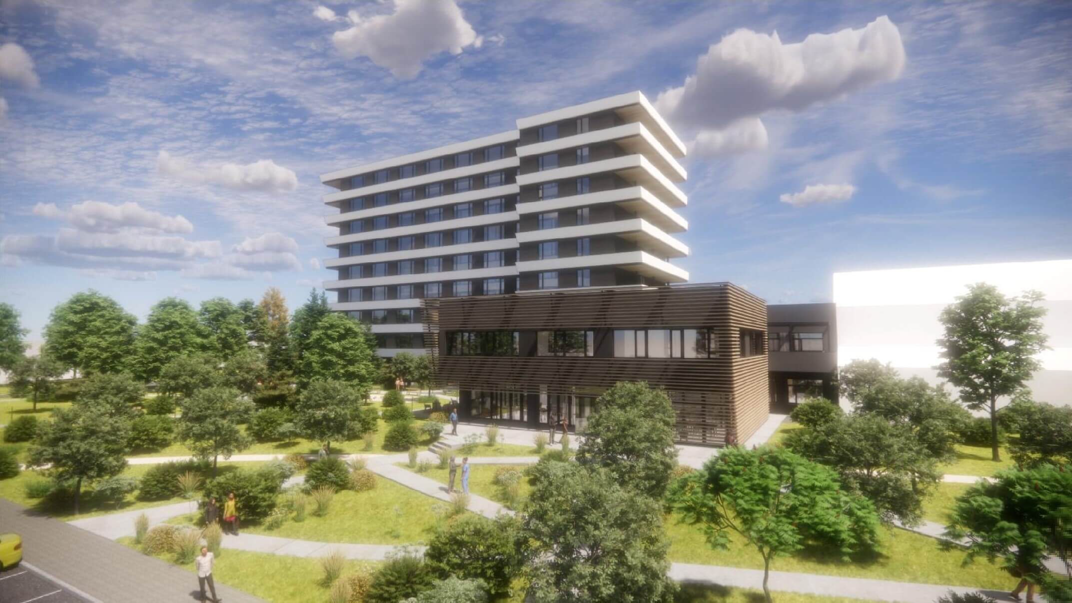 Projekt zahrnuje prostorné pokoje s vlastním sociálním zařízením, společenské místnosti pro setkávání, volnočasové aktivity, rekreační zóny a rozsáhlou zahradu pro odpočinek až pro 196 klientů.